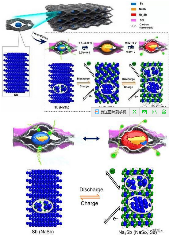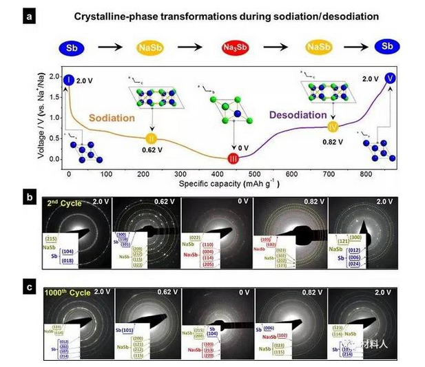 ?。╝)不同晶相/晶體結(jié)構(gòu)(Sb,NaSb,Na3Sb)在特定充放電電壓下循環(huán)期間,Sb-C骨架膜陽極的五種關(guān)鍵狀態(tài)示意圖;