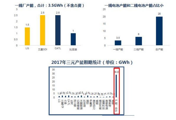 一線產(chǎn)能仍然不足。根據(jù)我們統(tǒng)計,2017年國內(nèi)一線電芯廠CATL、比亞迪的有效電池產(chǎn)能3.5GWh,一線合資電芯有效產(chǎn)能4GWh,如果合資仍然被國補排除在外,相對于9-12GWh的需求,一線電池廠的產(chǎn)能明顯不足。