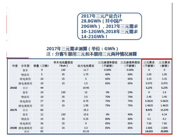 我們預測2017年、2018年三元需求分別為9GWh、15GWh(假設客車三元不解禁)/12GWh、21GWh(假設客車三元解禁)。