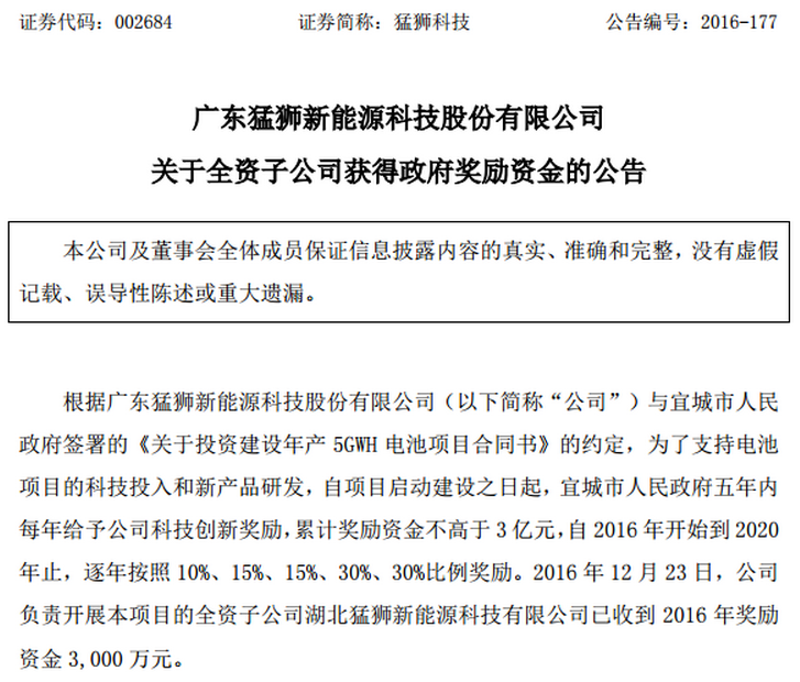 猛獅科技(002684)12月23日晚間發(fā)布公告稱,公司與宜城市人民政府簽署的《關于投資建設年產5GWH電池項目合同書》的約定,為了支持電池項目的科技投入和新產品研發(fā),自項目啟動建設之日起,宜城市人民政府五年內每年給予公司科技創(chuàng)新獎勵,累計獎勵資金不高于3億元,自2016年開始到2020年止,逐年按照10%、15%、15%、30%、30%比例獎勵。2016年12月23日,公司負責開展本項目的全資子公司湖北猛獅新能源科技有限公司已收到2016年獎勵資金3,000萬元。