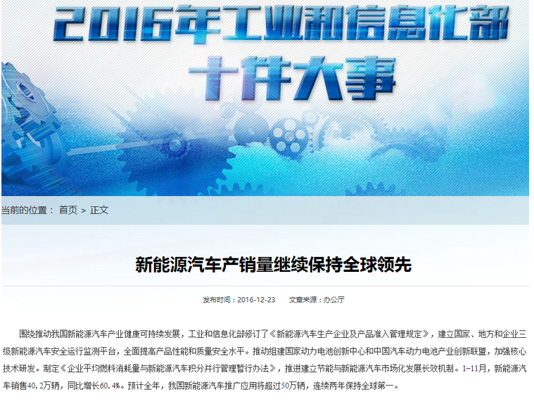 12月25日下午,工信部信息中心發(fā)布工信微報(bào),詳細(xì)介紹了工信部2016年為新能源汽車產(chǎn)業(yè)所做的重點(diǎn)工作以及下一步的工作安排。以下為原文: