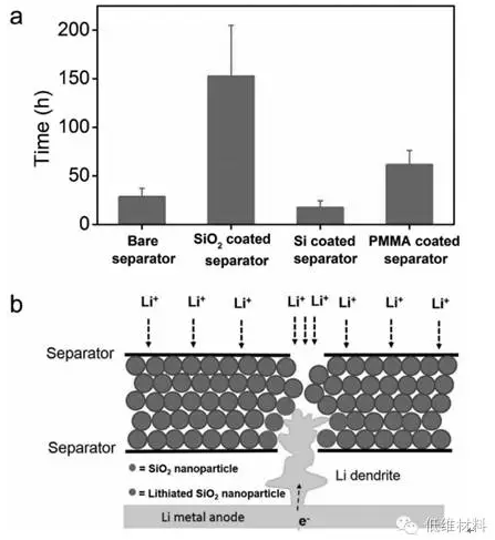 實(shí)驗(yàn)分別將納米二氧化硅三明治隔膜、普通隔膜、納米硅三明治隔膜、PMMA三明治隔膜進(jìn)行對(duì)比,發(fā)現(xiàn)納米二氧化硅三明治隔膜可更有效的減緩枝晶進(jìn)一步生長(zhǎng),提高鋰金屬電池的安全性。