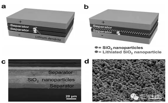 最近,CuiYi課題組通過(guò)制備納米二氧化硅三明治隔膜的方法來(lái)延長(zhǎng)鋰金屬電池的壽命。相比于傳統(tǒng)的三明治隔膜,該隔膜的特點(diǎn)在于:(1)納米二氧化硅作為中間夾層,可防止副反應(yīng)發(fā)生;(2)納米二氧化硅顆粒的堆積可為鋰離子和電解液的透過(guò)提供足夠的空間;(3)二氧化硅為絕緣材料,只有在鋰金屬刺入隔膜時(shí)才可發(fā)生反應(yīng),防止枝晶進(jìn)一步生長(zhǎng)。
