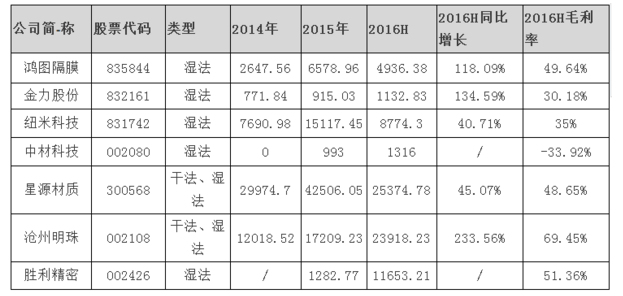 受下游應(yīng)用快速增長的影響,2015年鋰電池濕法隔膜企業(yè)營收均取得了較好的市場表現(xiàn),同比增長大多在50%。從2016年上半年各企業(yè)營收情況來看,濕法隔膜類上市公司成長性及毛利率都處于較高水平。