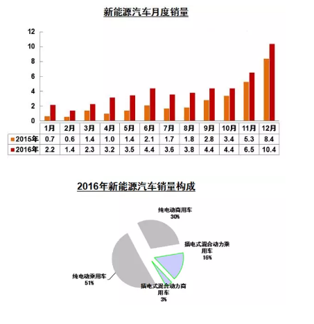 1月12日,中國汽車工業(yè)協(xié)會(huì)對(duì)外發(fā)布的數(shù)據(jù)顯示, 2016年新能源汽車生產(chǎn)51.7萬輛,銷售50.7萬輛,比上年同期分別增長51.7%和53%。