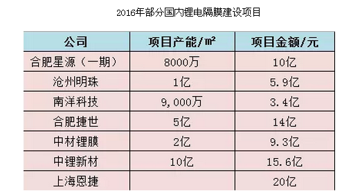 2016年,鋰電隔膜生產(chǎn)線建設(shè)更是如火如荼,產(chǎn)能進(jìn)一步急劇擴(kuò)張。新材料在線了解到,星源材質(zhì)、滄州明珠、南洋科技、合肥捷世、中材科技、紐米科技等均有投資新建項(xiàng)目。