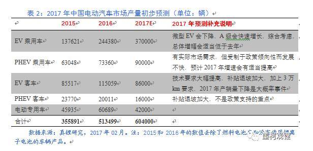 在燃料與積分辦法的壓力下,今年合資車企很可能加大電動(dòng)乘用車產(chǎn)品的開發(fā)力度,考慮到這個(gè)因素,2017年EV乘用車的發(fā)展速度有可能會(huì)比表中預(yù)測(cè)要快一些,我們對(duì)該類車的上限預(yù)測(cè)數(shù)值是40萬輛。基于此,真鋰研究對(duì)今年新能源汽車的銷量初步預(yù)測(cè)是60.4-63.4萬輛之間。