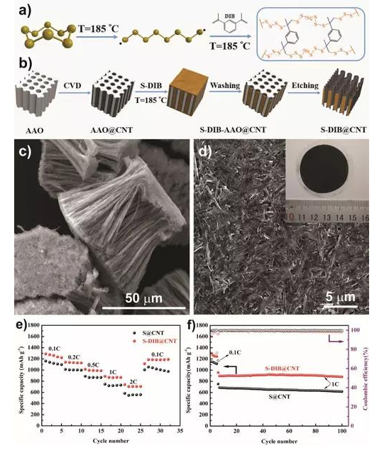 近期,中國科學(xué)院金屬研究所沈陽材料科學(xué)國家(聯(lián)合)實驗室先進炭材料研究部儲能材料與器件研究組在高性能多組元復(fù)合硫電極材料方面開展了系列研究工作。他們首先采用密度泛函理論計算,以氮摻雜石墨烯作為模型,發(fā)現(xiàn)在不同的氮摻雜形式中吡啶氮的團簇能夠較強地吸附多硫化物分子,并提出了組元與多硫化物相互作用的能量判斷關(guān)系。在此基礎(chǔ)上,通過氨氣高溫處理氧化石墨烯的方法,獲得了具有優(yōu)異電化學(xué)性能、高含氮量的氮摻雜石墨烯。為了進一步提高對多硫化物的限制效果,將碳納米管對多硫化物的物理限制作用與有機硫聚合物中碳-硫鍵對多硫化物的化學(xué)限制作用相結(jié)合,將有機硫聚合物裝填到陽極氧化鋁為模板合成出的碳納米管中,制備出有機硫聚合物/碳納米管復(fù)合材料(圖1)。該復(fù)合材料通過碳納米管的管腔物理限制多硫化物溶解,同時利用有機硫聚合物中的碳-硫鍵進行化學(xué)方式固定硫,協(xié)同抑制了多硫化物的穿梭效應(yīng)。