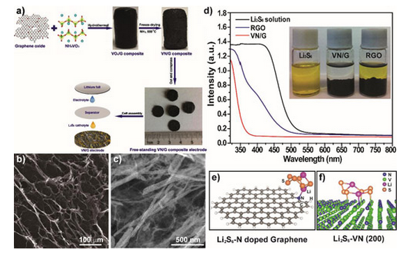 然而,對(duì)于非極性的碳材料,即使通過(guò)摻雜等處理仍不能進(jìn)一步提高其對(duì)極性多硫化物的有效吸附,從而難以完全抑制穿梭效應(yīng)。理論計(jì)算的結(jié)果表明,利用極性氧化物來(lái)化學(xué)吸附多硫化物、抑制穿梭效應(yīng)的效果要明顯優(yōu)于碳材料。但是絕緣的氧化物會(huì)阻礙電子和鋰離子的傳輸,降低硫的利用率和倍率性能。如何綜合兩者的特點(diǎn),找到高導(dǎo)電的極性吸附材料就成為研究的核心。為此,研究人員提出構(gòu)建具有化學(xué)錨定多硫化物的碳基復(fù)合材料電極的研究思路,將碳納米材料和具有化學(xué)錨定多硫化物功能的高導(dǎo)電金屬氮化物相結(jié)合,采用一步水熱法將氮化釩納米帶負(fù)載在三維石墨烯基體上,以多硫化鋰作為活性物質(zhì)填充在石墨烯與氮化釩復(fù)合材料集流體的三維孔道中(如圖2所示)。這種復(fù)合的正極結(jié)構(gòu)既充分利用了石墨烯三維骨架和孔結(jié)構(gòu),又結(jié)合了高導(dǎo)電的極性氮化釩對(duì)多硫化物的化學(xué)吸附和轉(zhuǎn)化促進(jìn)作用,有效解決了由“穿梭效應(yīng)”帶來(lái)的容量衰減及庫(kù)倫效率低等問(wèn)題,獲得了優(yōu)異的電化學(xué)性能。相比于單一的石墨烯電極,氮化釩/石墨烯復(fù)合電極的極化更小、氧化還原反應(yīng)動(dòng)力學(xué)更快,顯示了較好的倍率和循環(huán)性能,在高能鋰硫電池的應(yīng)用中可能具有巨大潛力。同時(shí),金屬氮化物是一個(gè)大家族,其高導(dǎo)電性與化學(xué)極性的特征,可為相關(guān)電化學(xué)應(yīng)用提供新選擇。