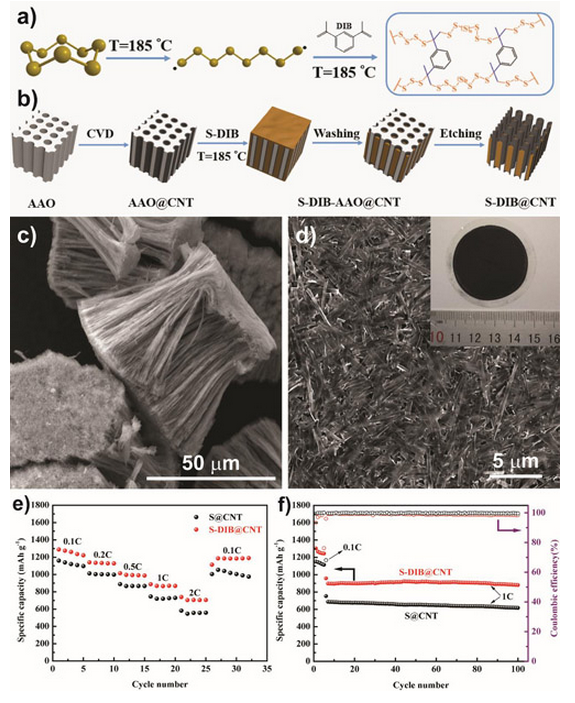 近期,中國(guó)科學(xué)院金屬研究所沈陽(yáng)材料科學(xué)國(guó)家(聯(lián)合)實(shí)驗(yàn)室先進(jìn)炭材料研究部?jī)?chǔ)能材料與器件研究組在高性能多組元復(fù)合硫電極材料方面開(kāi)展了系列研究工作。他們首先采用密度泛函理論計(jì)算,以氮摻雜石墨烯作為模型,發(fā)現(xiàn)在不同的氮摻雜形式中吡啶氮的團(tuán)簇能夠較強(qiáng)地吸附多硫化物分子,并提出了組元與多硫化物相互作用的能量判斷關(guān)系。在此基礎(chǔ)上,通過(guò)氨氣高溫處理氧化石墨烯的方法,獲得了具有優(yōu)異電化學(xué)性能、高含氮量的氮摻雜石墨烯。為了進(jìn)一步提高對(duì)多硫化物的限制效果,將碳納米管對(duì)多硫化物的物理限制作用與有機(jī)硫聚合物中碳-硫鍵對(duì)多硫化物的化學(xué)限制作用相結(jié)合,將有機(jī)硫聚合物裝填到陽(yáng)極氧化鋁為模板合成出的碳納米管中,制備出有機(jī)硫聚合物/碳納米管復(fù)合材料(圖1)。該復(fù)合材料通過(guò)碳納米管的管腔物理限制多硫化物溶解,同時(shí)利用有機(jī)硫聚合物中的碳-硫鍵進(jìn)行化學(xué)方式固定硫,協(xié)同抑制了多硫化物的穿梭效應(yīng)。