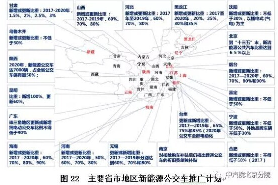 (2)2015年11月3日,交通運(yùn)輸部、財(cái)政部、工業(yè)和信息化部三部委聯(lián)合印發(fā)《新能源公交車推廣應(yīng)用考核辦法》(試行)。新能源公交車推廣應(yīng)用目標(biāo)完成情況主要考核各省(區(qū)、市)每自然年度內(nèi)新增及更換的公交車中新能源公交車的比重。2017年,新增及更換的公交車中新能源公交車的比重20%-60%。