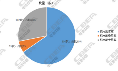 從上圖中可以看出,在本批次公示中,汽車廠商申報(bào)的純電動(dòng)客車車型共有330款,占據(jù)了純電動(dòng)新能源汽車全部申報(bào)車型的65%;純電動(dòng)專用車其次,共142款,占比28%;純電動(dòng)乘用車共有33款,占比7%。