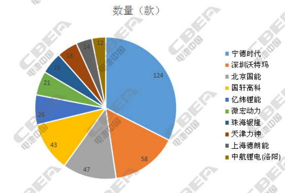 在電池供應(yīng)商方面,寧德時(shí)代共有124款電池產(chǎn)品與各類電動(dòng)車相配套,產(chǎn)品數(shù)量在所有供應(yīng)商中居第一位;深圳沃特瑪共有58款產(chǎn)品出現(xiàn)在公示名單中,占據(jù)第二位;第三位是北京國(guó)能的47款;位列第4-10位的企業(yè)分別是國(guó)軒高科、億緯鋰能、微宏動(dòng)力、珠海銀隆、天津力神、上海德朗能和中航鋰電(洛陽(yáng))。此外,還有其他若干家電池企業(yè)也有不同類型產(chǎn)品在本批次公示中上榜,共123款,但每家企業(yè)的產(chǎn)品數(shù)量較少均為個(gè)位數(shù),在此不再一一列舉。
