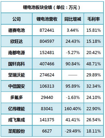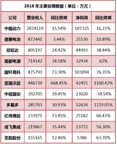 綜合來(lái)看,2016年鋰電池上市企業(yè)在營(yíng)業(yè)收入和凈利潤(rùn)上普遍實(shí)現(xiàn)了兩位數(shù)的增長(zhǎng)。