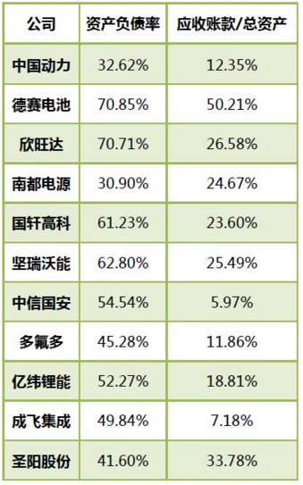 資金風(fēng)險(xiǎn)方面,從資產(chǎn)負(fù)債率看,目前11家上市公司資金情況總體良好,但德賽電池和欣旺達(dá)負(fù)債率偏高,超過(guò)了70%。另有企業(yè)在年報(bào)中提及應(yīng)收賬款回收風(fēng)險(xiǎn),11家公司應(yīng)收賬款占總資產(chǎn)的比例平均值超過(guò)20%,德賽電池這一數(shù)值超過(guò)50%。