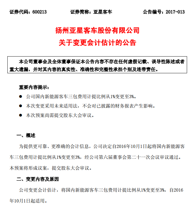 亞星客車提高新能源客車三包費用計提比例,預計2016年減少利潤2232萬元