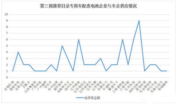 從第三批推薦目錄中車企選擇合作的電池企業(yè)看,在三元電池上,選擇與上海德朗能、比克電池與億緯鋰能合作的企業(yè)最多;選配磷酸鐵鋰的車企多選擇與沃特瑪合作;錳酸鐵鋰只有星恒一家,也只有一家車企選擇與之合作。