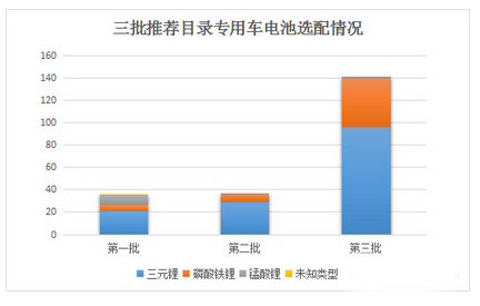 從今年幾批推薦目錄中專用車電池的選配情況看,三元材料電池的比重一直都在50%以上,占絕對優(yōu)勢;磷酸鐵鋰則起伏不定,前兩批數(shù)量較少,第三批有一定比重;錳酸鋰的話,今年第一批目錄中有一定比重,但到了今年的2-3批中,僅有1款車型選配錳酸鋰。