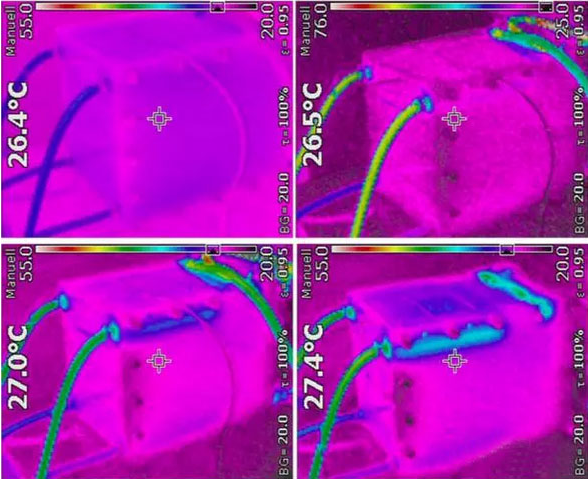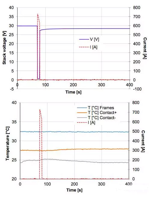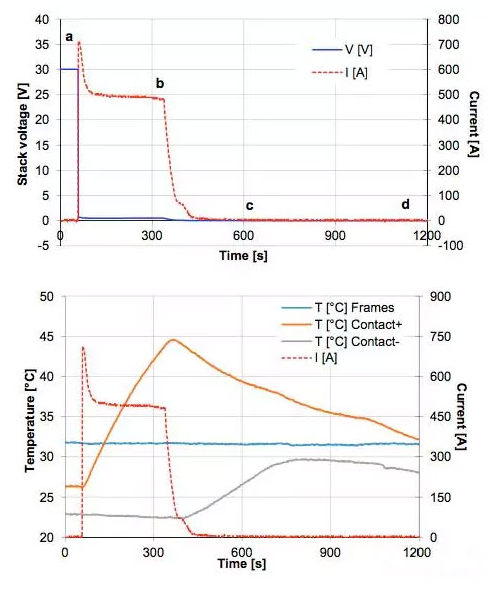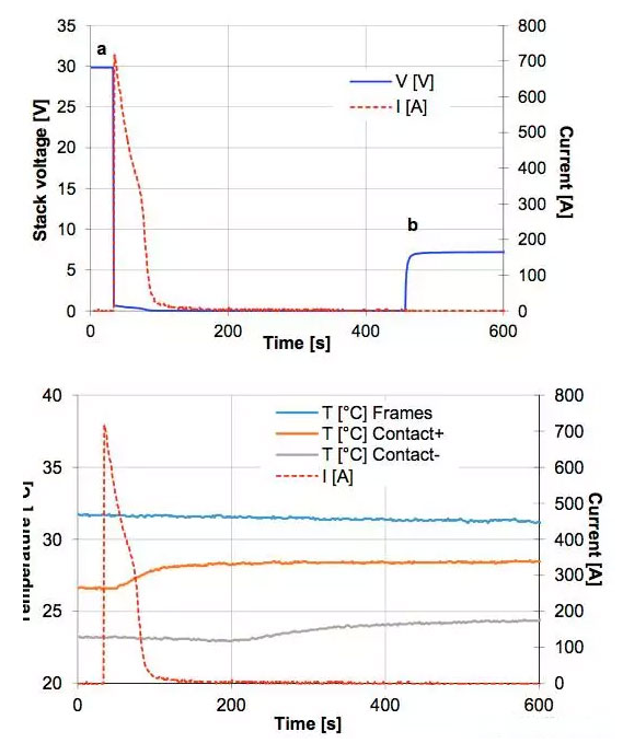 對(duì)于液流電池最危險(xiǎn)的短路情況就是,在電解液循環(huán)泵工作的情況下發(fā)生短路,并且沒(méi)有保險(xiǎn)絲的保護(hù),一般來(lái)說(shuō)這種情況容易在電池組維護(hù)的過(guò)程中發(fā)生。A.H.Whitehead利用20串電池對(duì)這種情況進(jìn)行了模擬,短路發(fā)生后電解液循環(huán)泵將繼續(xù)工作280s(一般而言,電池管理系統(tǒng)在發(fā)現(xiàn)短路后能夠在280s內(nèi)關(guān)閉電解液循環(huán)泵),測(cè)試結(jié)果如下圖所示,在短路的瞬間電池電流超過(guò)了700A,隨后短路電流下降到490A左右,并持續(xù)到電解液循環(huán)泵關(guān)閉,電池的熱成像儀圖像如下圖所示,電池溫度升高主要在正負(fù)極接線柱上,在整個(gè)測(cè)試過(guò)程中電池沒(méi)有發(fā)生泄漏、起火等。電池在短路測(cè)試后進(jìn)行的電化學(xué)測(cè)試,也表明電池性能沒(méi)有受到短路的影響。