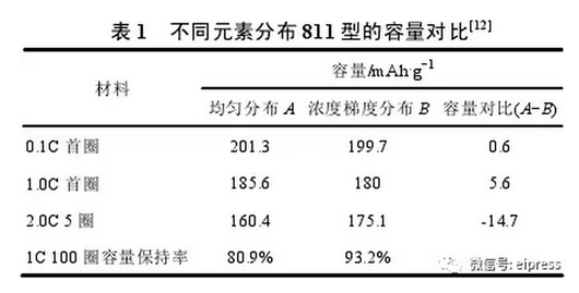 HUA等采用共沉淀法制備了線性梯度的811型,從顆粒內(nèi)核至表面,鎳含量依次遞減,錳含量依次遞增,從表1可明顯看到線性梯度分布的811三元材料大倍率下放電容量和循環(huán)性明顯優(yōu)于元素均勻分布的811型。