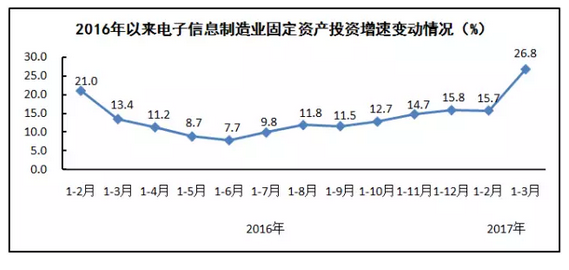 固定資產(chǎn)投資增速明顯加快。一季度,電子信息制造業(yè)500萬元以上項(xiàng)目完成固定資產(chǎn)投資額同比增長26.8%,增速同比加快13.4個(gè)百分點(diǎn)。