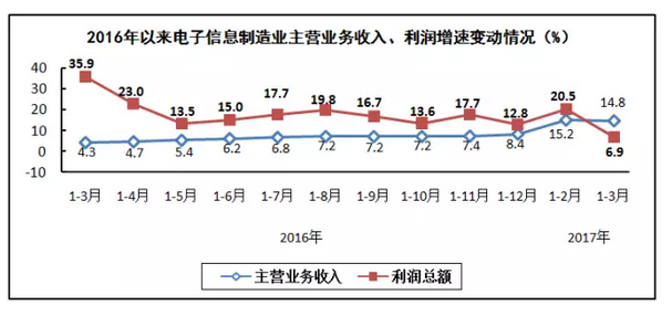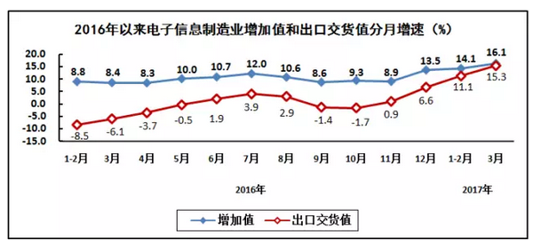生產(chǎn)繼續(xù)加快,出口較快增長。一季度,規(guī)模以上電子信息制造業(yè)增加值同比增長14.9%,同比加快6.3個(gè)百分點(diǎn);快于全部規(guī)模以上工業(yè)增速8.1個(gè)百分點(diǎn),占規(guī)模以上工業(yè)增加值比重為7.3%。其中,3月份增速為16.1%。出口交貨值同比增長13%(去年同期為下降6.3%)。其中,3月份出口交貨值同比增長15.3%。