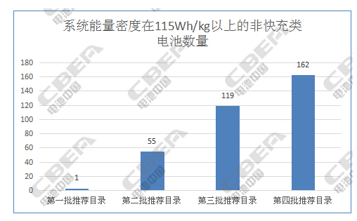 據(jù)電池中國(guó)網(wǎng)統(tǒng)計(jì),前四批推薦目錄中,電池系統(tǒng)能量密度在115Wh/kg以上的純電動(dòng)客車車型共337款,約占純電動(dòng)客車數(shù)量的50.3%,根據(jù)最新的新能源汽車財(cái)政補(bǔ)貼政策,這些車型可獲得1.2倍的財(cái)政補(bǔ)貼。第1-4批數(shù)量分別為1款、55款、119款和162款,可見(jiàn),在補(bǔ)貼政策的引導(dǎo)下,純電動(dòng)客車配套電池的系統(tǒng)能量密度提升迅速,原本業(yè)界擔(dān)心,由于補(bǔ)貼政策趨嚴(yán),會(huì)對(duì)純電動(dòng)客車上目錄造成嚴(yán)重影響,現(xiàn)在看來(lái),這種影響正在趨于緩和。