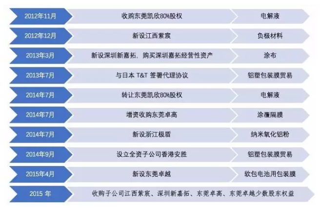 2015年9月11日,璞泰來收購東莞卓高剩下 35%的股權,對價1200萬,從而達到100%控股。