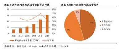 鋰電池的下游應(yīng)用主要包括動(dòng)力電池、消費(fèi)類電池和鋰電儲(chǔ)能三大領(lǐng)域。2014年之前,受益于3C數(shù)碼產(chǎn)品的需求擴(kuò)張,消費(fèi)類鋰電池市場(chǎng)規(guī)模持續(xù)較快增長(zhǎng)。2014年以來(lái)新能源汽車產(chǎn)業(yè)受政策支持和技術(shù)進(jìn)步推動(dòng)而高速發(fā)展,2014、2015年連續(xù)兩年增速超300%。根據(jù)2016年的統(tǒng)計(jì)數(shù)據(jù),動(dòng)力電池已經(jīng)躍升至鋰電池消費(fèi)結(jié)構(gòu)中第一大需求,占比達(dá)48%。