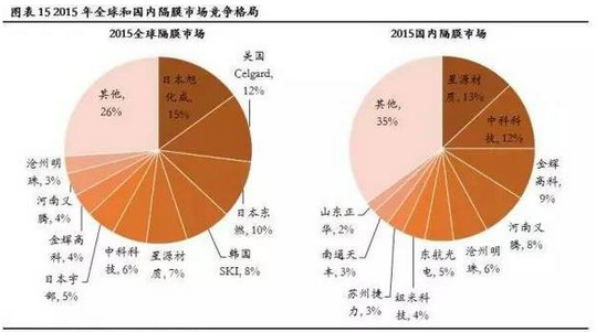 可以看到,鋰電池隔膜的生產(chǎn)工藝復(fù)雜、流程眾多,因而對(duì)生產(chǎn)設(shè)備和流程控制均有著較高的要求,此前較長(zhǎng)時(shí)期內(nèi)國(guó)內(nèi)隔膜進(jìn)口依存度居高不下。2015年,日本旭化成、美國(guó)Celgard公司、日本東燃、韓國(guó)SKI等前4名國(guó)際巨頭占據(jù)全球約45%的市場(chǎng)份額;同時(shí)注意到,這些國(guó)際大型隔膜廠商均是有著40年以上歷史的老牌化工企業(yè),技術(shù)和聲譽(yù)積淀深厚。