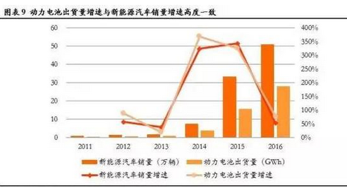 動(dòng)力電池是指為新能源汽車、電動(dòng)自行車等提供動(dòng)力來(lái)源的電池,目前幾乎全部采用技術(shù)相對(duì)成熟的鋰電池。在國(guó)家能源戰(zhàn)略的指導(dǎo)規(guī)劃下,2014年以來(lái)新能源汽車相關(guān)政策集中出臺(tái),加之國(guó)內(nèi)動(dòng)力鋰電池技術(shù)不斷進(jìn)步,整個(gè)產(chǎn)業(yè)鏈進(jìn)入高速發(fā)展期。受到新能源汽車需求爆發(fā)的直接拉動(dòng),2014年以來(lái)動(dòng)力電池出貨量也呈現(xiàn)同步高速增長(zhǎng)態(tài)勢(shì)。