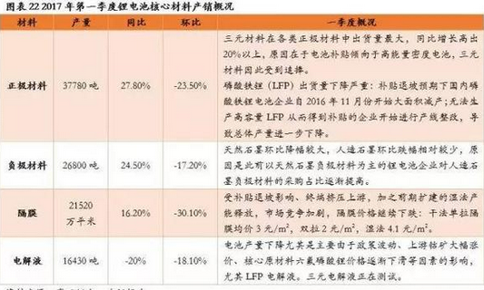 進(jìn)入2017年以來(lái),受到新能源汽車行業(yè)的補(bǔ)貼退坡、推薦目錄“重做”的影響,新能源車企的訂單派發(fā)都比較謹(jǐn)慎,因此整個(gè)鋰電池產(chǎn)業(yè)鏈的行業(yè)風(fēng)向、出貨量和盈利水平都受到了一定程度的影響,特別在鋰電池四大核心材料:正極、負(fù)極、隔膜和電解液等細(xì)分領(lǐng)域反映得十分顯著。2017年第一季度產(chǎn)銷情況相比2016年第四季度整體呈下滑態(tài)勢(shì),但更加符合高能量密度動(dòng)力電池要求的三元正極材料、人造石墨和中高端濕法隔膜表現(xiàn)更優(yōu)。