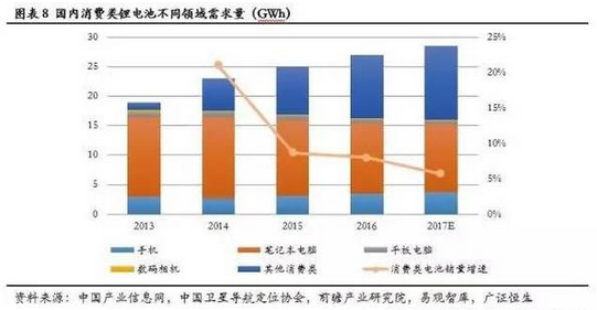 消費(fèi)類電子產(chǎn)品是鋰電池自商用以來(lái)最主要的應(yīng)用領(lǐng)域,主要包括手機(jī)、筆記本電腦、平板電腦、數(shù)碼相機(jī)等傳統(tǒng)3C數(shù)碼類需求,以及網(wǎng)絡(luò)設(shè)備、游戲設(shè)備、導(dǎo)航設(shè)備、可穿戴設(shè)備、電動(dòng)工具等新興需求。2014年前后,由于市場(chǎng)趨于飽和,傳統(tǒng)3C數(shù)碼類電子產(chǎn)品的消費(fèi)量均出現(xiàn)不同程度的下滑;而新興需求端,如導(dǎo)航終端設(shè)備、智能可穿戴設(shè)備的市場(chǎng)規(guī)模則呈現(xiàn)較快擴(kuò)張的態(tài)勢(shì);綜合預(yù)計(jì)消費(fèi)類鋰電池銷量增速將保持在5%以上。