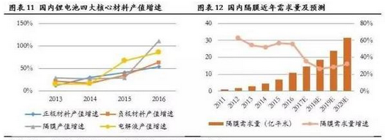 鋰電池需求量的持續(xù)高速增長(zhǎng)帶來(lái)了整個(gè)鋰電池產(chǎn)業(yè)鏈的高度景氣,特別是作為整個(gè)產(chǎn)業(yè)技術(shù)核心環(huán)節(jié)的鋰電材料領(lǐng)域,近年來(lái)行業(yè)增速不斷加快;2016年鋰電池四大核心材料:正極、負(fù)極、隔膜和電解液的行業(yè)產(chǎn)值增速均超過(guò)50%。未來(lái)我們預(yù)期鋰電池隔膜的需求量將保持30%左右的增速,至2020年隔膜需求量有望超過(guò)30億平方米。