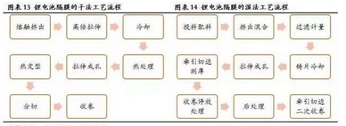 鋰電池隔膜的生產(chǎn)技術(shù)主要分為干法和濕法兩大工藝。干法工藝是將原料(PE或PP)進(jìn)行高溫成膜后退火處理,進(jìn)一步拉伸形成微孔膜;可細(xì)分為單向拉伸和雙向拉伸,其中干法雙拉工藝是中國(guó)科學(xué)院在20世紀(jì)90年代初開(kāi)發(fā)出的具有自主知識(shí)產(chǎn)權(quán)的工藝。濕法工藝?yán)孟喾蛛x的原理,將小分子物質(zhì)與PE混合,加熱熔融后降溫進(jìn)行相分離,得到微孔膜。