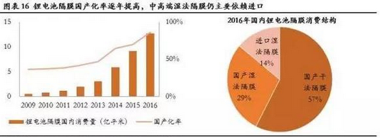 2016年隔膜國(guó)內(nèi)消費(fèi)量數(shù)據(jù)顯示,隔膜的整體國(guó)產(chǎn)化率已經(jīng)達(dá)到86%;其中干法隔膜早已完全實(shí)現(xiàn)了國(guó)產(chǎn)化;而國(guó)內(nèi)濕法隔膜的出貨量也達(dá)到3億平米以上;但中高端濕法隔膜大多仍然依賴進(jìn)口,60%以上中高端市場(chǎng)被日本、韓國(guó)、美國(guó)等國(guó)外隔膜廠商所占有。