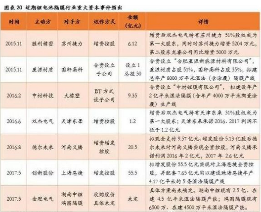 隔膜作為鋰電池四大核心材料中唯一沒(méi)有實(shí)現(xiàn)完全國(guó)產(chǎn)化的領(lǐng)域,近年來(lái)受到資本市場(chǎng)的高度關(guān)注和追捧。自2015年以來(lái),隔膜行業(yè)并購(gòu)和合資事件頻出,以材料業(yè)上市公司為代表的兼具相關(guān)產(chǎn)業(yè)背景和雄厚資金實(shí)力的企業(yè),紛紛加速對(duì)鋰電池隔膜市場(chǎng)的布局速度;技術(shù)領(lǐng)先且市場(chǎng)占有率較高的優(yōu)質(zhì)隔膜企業(yè)如蘇州捷力、河南義騰等陸續(xù)被并購(gòu),且交易價(jià)格不斷攀升,2017年5月創(chuàng)新股份發(fā)布公告擬并購(gòu)上海恩捷的支付對(duì)價(jià)高達(dá)55.5億元。此外,產(chǎn)業(yè)鏈中的相關(guān)公司也以新設(shè)子公司等方式謀求技術(shù)和資金的合作,增強(qiáng)其在行業(yè)中的競(jìng)爭(zhēng)實(shí)力。