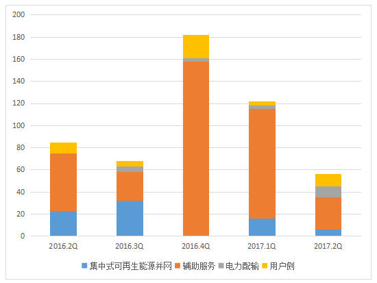 從應(yīng)用分布上看,全球新增投運(yùn)項(xiàng)目中,輔助服務(wù)領(lǐng)域的裝機(jī)規(guī)模最大,為28MW,所占比重為56%,同比下降42%,環(huán)比2017年一季度下降72%。