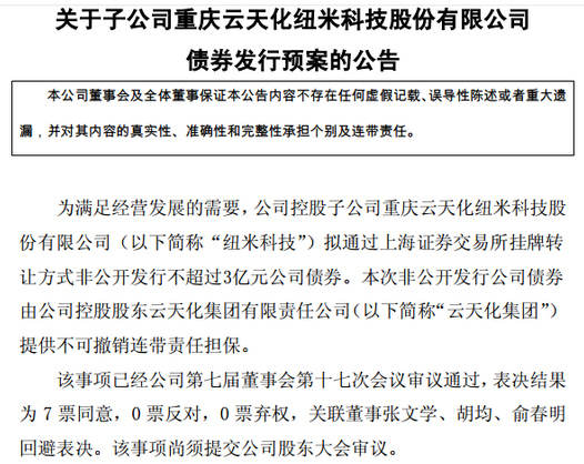 8月19日,云南云天化股份有限公司發(fā)布消息稱,為滿足經(jīng)營發(fā)展的需要,公司控股子公司重慶云天化紐米科技股份有限公司(以下簡稱“紐米科技”)擬通過上海證券交易所掛牌轉(zhuǎn)讓方式非公開發(fā)行不超過3億元公司債券。