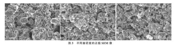 不同面密度極片在SEM下如圖3所示??梢姡瑯O片面密度越低,材料的孔隙率增大,單位質(zhì)量的材料電解液的吸附量因而增大,相應(yīng)的減小溶液接觸電阻;另一方面較小的面密度,極片厚度較小,減小鋰離子的擴(kuò)散距離,同時(shí)面密度越小,正負(fù)極材料的濃度差越小,降低擴(kuò)散的阻力,提高鋰離子在材料中的擴(kuò)散速度;且極片越薄,在充放電中鋰離子不斷的嵌入與脫出對(duì)極片結(jié)構(gòu)造成的變化也越小;同時(shí),面密度較小,化成時(shí)形成的SEI 薄而穩(wěn)定,減少鋰離子在SEI 膜中的遷移阻力。而面密度較大時(shí),界面電阻增大,從而降低鋰離子在材料中擴(kuò)散速度,當(dāng)大電流充電時(shí),鋰離子不容易從材料中脫出,易造成極化,可逆鋰離子減少,因而容量衰減。由此可見,想要使電池具有優(yōu)異的倍率性能,則需要降低極片的面密度。但是,這必將以電池的容量為代價(jià),快充快放與電池容量不可兼得,需要在兩者間把握一個(gè)合適的值。