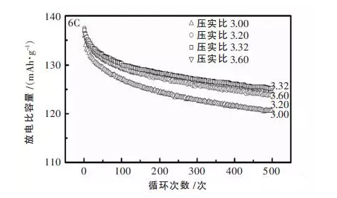 由圖4中可以看出,6 C大電流充電時(shí), 隨壓實(shí)密度增大其首次放電比容量差異不大,但隨著循環(huán)次數(shù)的增加,放電比容量和電池容量維持率均出現(xiàn)了先升高后降低的情況,電池在壓實(shí)密度為3.32g/cc時(shí),達(dá)到了循環(huán)性能最優(yōu)。