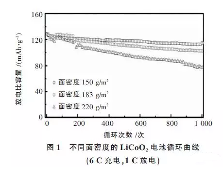 “充電五分鐘,通話一小時(shí)”是我們常常聽到的廣告,廣告涉及到的內(nèi)容其實(shí)是電池的快充功能。電池快充功能與電池極片的面密度和壓實(shí)密度密切相關(guān),為了驗(yàn)證不同面密度對(duì)電池快充的影響,利用鈷酸鋰為正極、石墨為負(fù)極制作了軟包電池。圖1是不同面密度極片的電池在快充(6C)條件下的循環(huán)表現(xiàn)。由圖1可以看出,6 C 大電流充電時(shí)隨正極面密度的減小,其放電比容量明顯提升,且循環(huán)提高。