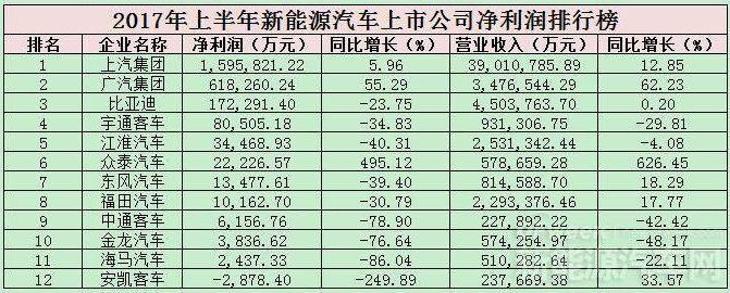 2017上半年,12家新能源汽車上市公司中有8家企業(yè)凈利潤過億。上汽集團(tuán)位列榜首,凈利潤159.58億元,同比增長5.96%。12家上市公司中有9家企業(yè)凈利潤下滑幅度較大,其中虧損最多的是安凱客車,凈利下滑249.89%。