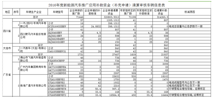 9月7日,工信部發(fā)布“關(guān)于2016年度新能源汽車推廣應用補助資金(補充申請)初步審核情況的公示”,2016年企業(yè)申報的新能源汽車推廣數(shù)為71446輛,企業(yè)申請的清算資金為32.08億元,專家組核定的推廣數(shù)為71199輛,應清算補助資金為31.43億元。