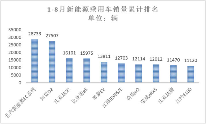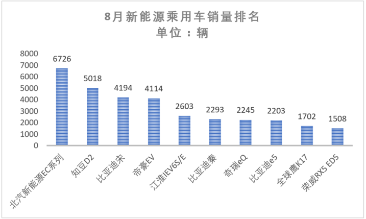 車型方面,8月銷量前三名分別是北汽新能源EC系列、知豆D2、比亞迪宋。