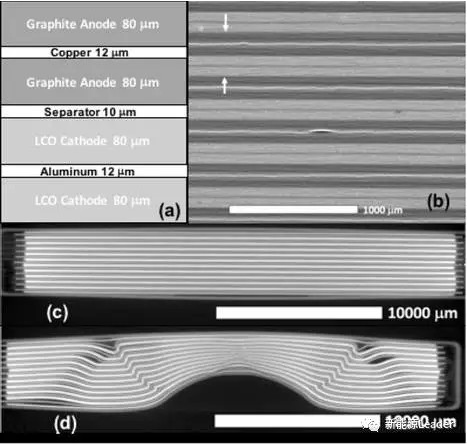 實驗中采用的為商用鈷酸鋰電池,電芯采用卷繞結(jié)構(gòu),尺寸為30mm?40mm?4.5mm,為了保證鋰離子電池在擠壓測試中不至于發(fā)生熱失控,Hsin Wang將電池的電量控制在10%SoC以內(nèi),下圖為電池進行擠壓測試后電芯的結(jié)構(gòu),其中圖c沒有經(jīng)過擠壓時電池的內(nèi)部結(jié)構(gòu),圖d為擠壓測試后電池的內(nèi)部結(jié)構(gòu),從圖上可以看到,擠壓測試后電極發(fā)生了對稱的折疊和褶皺現(xiàn)象,并且一些電極層發(fā)生了彎曲在電極層之間產(chǎn)生較大的間隙。