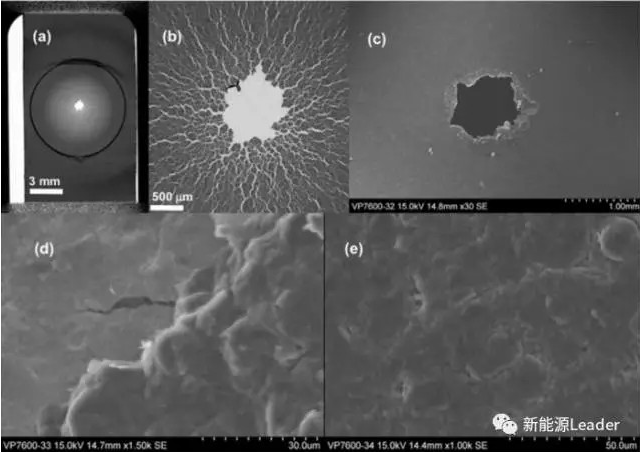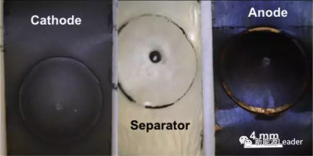 對上述實驗后的電池進行拆解,如下圖所示,可以看到在受到擠壓處的中間位置有一個短路點,但是通過光學觀察負極表面并沒有出現(xiàn)明顯的裂紋現(xiàn)象。