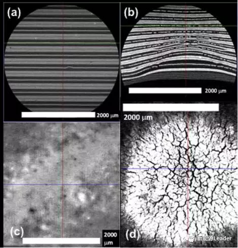 下圖為局部放大的圖像,從圖上可以注意到,在嵌切方向電極發(fā)生了嚴重的折疊和形變,通過圖c和圖d對比可以看到,電池在擠壓后銅箔表面產(chǎn)生了大量的裂紋。