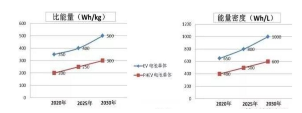 根據(jù)16年發(fā)布的“節(jié)能與新能源汽車技術路線圖”,我們可以大概對動力電池發(fā)展趨勢有一個概念,下圖所示,到2020年,純電動汽車電池單體比能量要達到350Wh/kg。