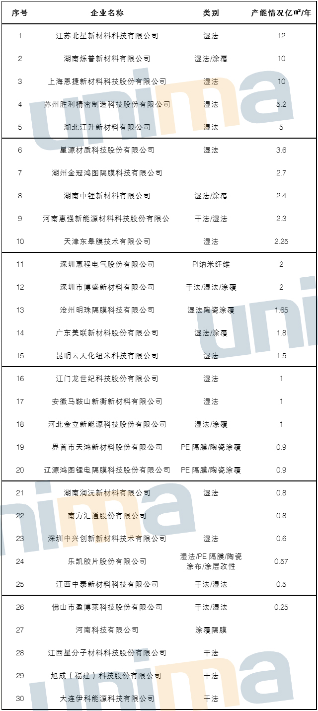 鋰電隔膜新增產(chǎn)能統(tǒng)計